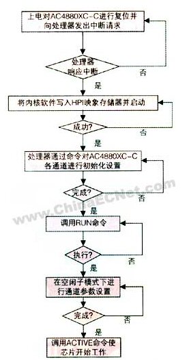 主要是基于嵌入式arm處理器,通過hpi接口實(shí)現(xiàn)對ac4880xc-c及相關(guān)芯片的讀寫操作。流程圖如圖5所示: