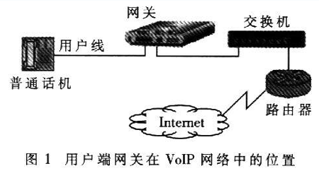 近年來隨著寬帶網(wǎng)絡(luò)和IP技術(shù)的日益發(fā)展,VoIP>(Volee over Internet Protoc01)技術(shù)的應(yīng)用越來越廣泛。網(wǎng)關(guān)是VoIP網(wǎng)絡(luò)中的重要設(shè)備,按照應(yīng)用領(lǐng)域可分為電信級網(wǎng)關(guān)和用戶端網(wǎng)關(guān)。用戶端網(wǎng)關(guān)設(shè)備主要應(yīng)用于小區(qū)和企業(yè),是連接終端電話和IP網(wǎng)絡(luò)的橋梁,主要功能是進(jìn)行語音編解碼、信令處理、VoIP協(xié)議處理和路由協(xié)議處理等。用戶端網(wǎng)關(guān)設(shè)備在VoIP網(wǎng)絡(luò)中的位置如圖1所示。可以看出,網(wǎng)關(guān)處于用戶電話線路部分的末端、IP網(wǎng)絡(luò)部分的起始端。