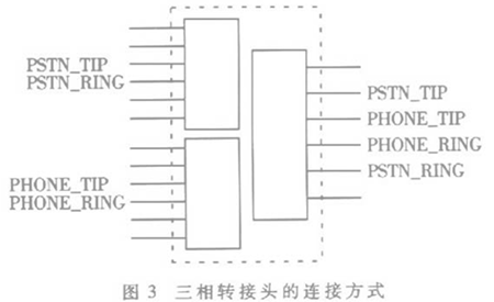 為了有效利用資源,系統(tǒng)使用三相轉(zhuǎn)接頭將電話線路與PSTN線路組合到一個RJ11接口上,每路話路使用一個三相轉(zhuǎn)接頭。三相轉(zhuǎn)接頭的連接方式如圖3所示。
