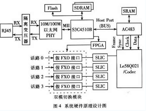 本節(jié)提出了一種基于H.323的雙模網(wǎng)關(guān)的系統(tǒng)設(shè)計(jì)方案,該方案支持4路話音,使用一種經(jīng)濟(jì)實(shí)用的“假FXO接口”方式實(shí)現(xiàn)雙模切換,能夠在VoIP通話時檢測到PSTN線上進(jìn)來的呼叫并可通過按話機(jī)的拍簧或者Flash閃斷鍵切換接聽!