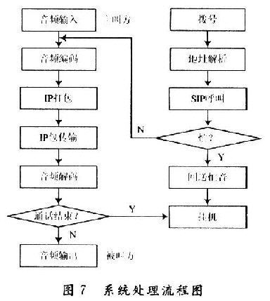 當撥號確認后,主控制器對編解碼器發(fā)送控制指令,開始語音A/D轉換,并進行編碼,送到片外存儲器內進行緩存;Nios CPU對撥號信息的解析確定。目的地址,通過Avalon總線對以太網接口發(fā)送數據傳輸指令;將符合以太網標準的數據從片外存儲器內讀出,送入Internet中,返回確認信息。系統(tǒng)處理流程圖如圖7所示。