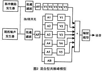 ----混 合 型 共 振 峰 模 型 在 級 聯(lián) 型 共 振 峰 合 成 模 型 中, 共 振 峰 濾 波 器 首 尾 相 接; 而 在 并 聯(lián) 型 模 型 中, 輸 入 信 號 先 分 別 通 過 幅 度 調(diào) 節(jié) 再 加 到 每 一 個(gè) 共 振 峰 濾 波 器 上, 然 后 將 各 路 的 輸 出 疊 加 起 來。 將 兩 者 比 較, 對 于 合 成 聲 源 位 于 聲 道 末 端 的 語 音( 大 多 數(shù) 的 元 音), 級 聯(lián) 型 合 乎 語 音 產(chǎn) 生 的 聲 學(xué) 理 論, 并 且 無 需 為 每 一 個(gè) 濾 波 器 分 設(shè) 幅 度 調(diào) 節(jié); 而 對 于 合 成 聲 源 位 于 聲 道 中 間 的 語 音( 大 多 數(shù) 清 擦 音 和 塞 音), 并 聯(lián) 型 則 比 較 合 適, 但 是 其 幅 度 調(diào) 節(jié) 很 復(fù) 雜。 基 于 此 種 考 慮, 人 們 將 兩 者 結(jié) 合 在 一 起, 提 出 了 混 和 型 共 振 峰 模 型, 如 圖2 所 示。