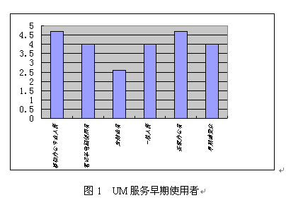 該調(diào)查還發(fā)現(xiàn),UM早期使用者將是在家辦公者,移動辦公專業(yè)人群、早期受眾、筆記本電腦使用者、一般人群、從事金融工作的人群,他們的使用傾向度如圖1所示,值越高表示越愿意使用。