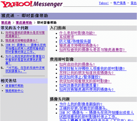選擇工具->開啟我的攝像頭后,就會彈出“我的即時影像”窗口(圖4),如果你的攝像頭安裝連接正常,可以馬上從這個窗口中看到你的影像;如果你的攝像頭正常,但在窗口中卻沒有看到影像,你可以在聯(lián)網(wǎng)的情況下選擇當前窗口中的幫助->即時影像幫助進入相關網(wǎng)頁(圖5)對你的攝像頭進行雅虎通的兼容性測試,或者尋求更為詳細的幫助。