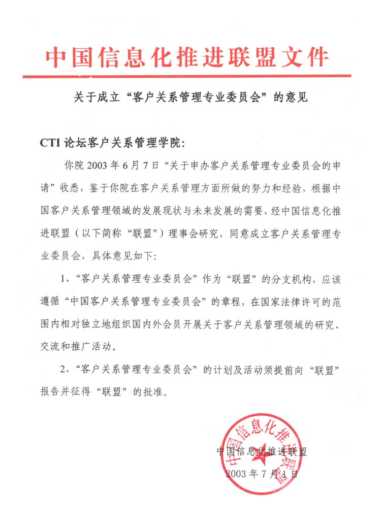 近日,由中國移動(dòng)、中國網(wǎng)通、中國聯(lián)通、海爾集團(tuán)、聯(lián)想集團(tuán)、摩托羅拉、微軟、CTI論壇等20多家單位發(fā)起籌備的"中國客戶關(guān)系管理專業(yè)委員會(huì)"(以下簡稱專委會(huì)),經(jīng)信息產(chǎn)業(yè)部中國信息化推進(jìn)聯(lián)盟的批準(zhǔn),正式在京成立。