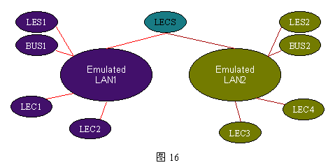每個ELAN(Emulated LAN)由一組LANE客戶(LEC)和LANE服務(wù)構(gòu)成。LEC還可以是作為ATM主機代理的網(wǎng)橋和路由器。LE服務(wù)由三個不同的功能實體構(gòu)成:LAN仿真配置服務(wù)器(LECS)、LAN服務(wù)器(LES)和BUS,這三個服務(wù)實體可以各自存在,但通常位于同一設(shè)備,例如:LES可以位于ATM交換機、路由器、網(wǎng)橋和工作站。ATM LANE的構(gòu)成及相互關(guān)系如下圖16所示: