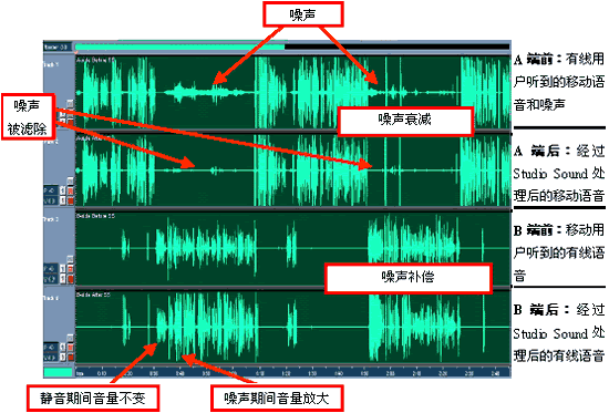 這里的結(jié)果顯示出,PSTN側(cè)收聽器接收到的噪音是如何被大大降低的,同時PSTN側(cè)說話的音量在無線側(cè)出現(xiàn)大聲的噪音期間被顯著地放大了。通過遍及全球的類似場合試驗,在應(yīng)用Studio Sound之前和應(yīng)用之后通話質(zhì)量的不同已經(jīng)深刻為許多業(yè)務(wù)提供商所了解。