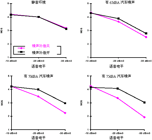 圖3 在噪聲補(bǔ)償功能上的MOS測試顯示出用戶感覺到話音質(zhì)量變化的明顯增加;