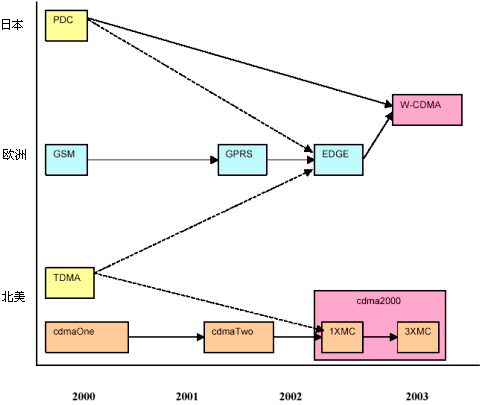3G的基本問(wèn)題版本多。有兩種正在顯現(xiàn)的3G標(biāo)準(zhǔn)。盡管從技術(shù)上講,它們都屬于CDMA的范疇,但是在現(xiàn)實(shí)中(從實(shí)施的觀點(diǎn)上看),它們并不相同。如圖4所示,cdma-2000(1XMC繼之以3XMC)是cdmaOne和cdmaTwo的接替者。類似地,W-CDMA是GSM的接替者。每一種標(biāo)準(zhǔn)都能向后兼容其前輩,而且每一種體系結(jié)構(gòu)都提供了與其他結(jié)構(gòu)的接口。
