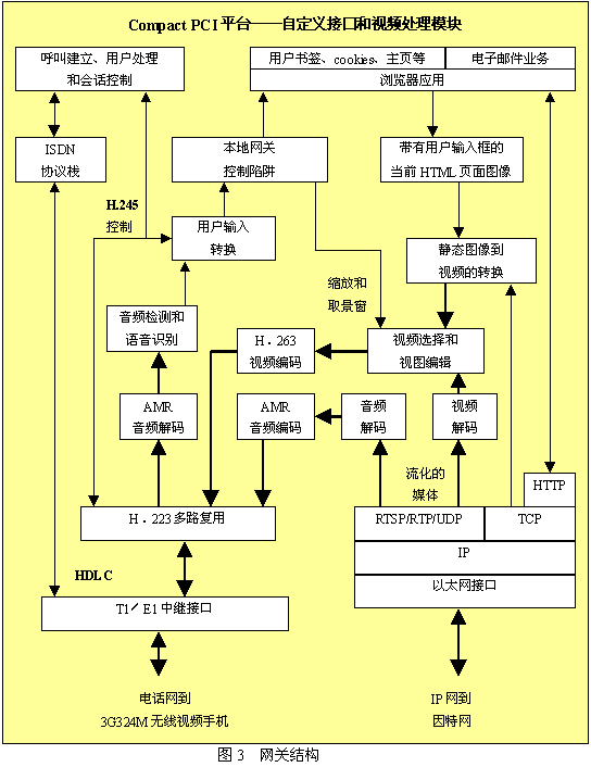 圖3所示為網(wǎng)關(guān)重要組成的分解圖。網(wǎng)關(guān)機箱很可能是一個Compact PCI機箱,機箱中包含了作為網(wǎng)絡(luò)中一個節(jié)點的所有組件。基本的視頻呼叫和瀏覽器應(yīng)用可以運行在主處理器上,但T1或E1接口需要由附加模塊來支持。為了支持大量的端口,還需要附加的以太網(wǎng)接口和自定義的視頻處理模塊。T1/E1接口通過公共電話網(wǎng)接入無線交換中心,也可以直接接入到無線交換中心。以太網(wǎng)接口會通過標(biāo)準(zhǔn)IP路由器接入到因特網(wǎng)。