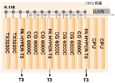 HYPER-T3接入適配板,它用于通過T3線上的1344個(gè)端口從PSTN接入語(yǔ)音和傳真媒體。這些媒體會(huì)從DS3轉(zhuǎn)換到DS0,然后通過H.110總線發(fā)送給6塊CG6000C中的一塊。CG6000C會(huì)壓縮這些語(yǔ)音和傳真媒體,然后用UDP/IP上實(shí)時(shí)協(xié)議(RTP)對(duì)它們進(jìn)行打包。再通過板上的兩個(gè)以太網(wǎng)接口發(fā)送到一個(gè)語(yǔ)音級(jí)的IP包網(wǎng)絡(luò)上。請(qǐng)注意,每種板都使用了N+1板卡級(jí)的冗余備份。