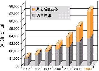 為了獲得競爭優(yōu)勢,業(yè)務提供商──傳統(tǒng)長途運營和本地交換運營商,因特網業(yè)務提供商(ISP),應用業(yè)務提供商,以及無線運營商──都在想方設法發(fā)布基于IP的業(yè)務,這些業(yè)務應該:對用戶有較高的價值,能縮短面市所需時間,部署是低成本高效益的。向用戶提供高價值的增值業(yè)務能為業(yè)務提供商帶來重要的收入源泉,并使他們更有特色,增加市場分額,特別是如果這些業(yè)務以快速、易于支持的方式部署,以上這些優(yōu)勢就會更加突出。據估計,到2003年增值業(yè)務設備僅在美國就能達到73億美元的市場,正如圖1所示。