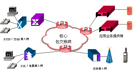 各種應用業(yè)務提供商通過核心網絡提供公共業(yè)務。相比于傳統(tǒng)電信數據網,由于IP包交換網是一個非常成熟的網絡,有龐大的軟件開發(fā)隊伍,能夠更快地開發(fā)出更多的業(yè)務,成本也會更低。