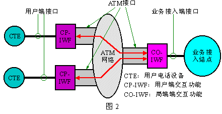 下圖2是VoATM的參考模型。其中的CTE為用戶電話終端設備,“業(yè)務接入結點”是指用戶電話業(yè)務的提供網絡在ATM網絡側的界;其中的CP-IWF完成用戶電路和ATM網絡的協(xié)作功能,而CO-IWF則完成ATM網絡和業(yè)務網絡的協(xié)作功能。