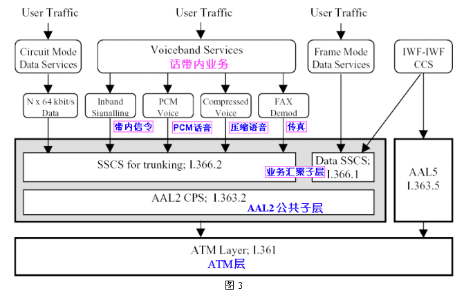 話帶業(yè)務包括標準PCM、壓縮語音和FAX等。它們在ATM網絡的傳輸主要有兩種方式:LES和VoIP/AAL5/ATM。