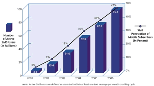 SMS在美國(guó)的使用落后于歐洲和日本, 但是工業(yè)分析是預(yù)測(cè)它會(huì)很快地趕上來(lái). 請(qǐng)見(jiàn)圖1. 活躍的SMS用戶預(yù)計(jì)會(huì)從2002年的9%增加到2006年的47%.