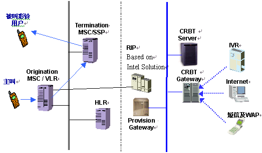 CRBT RIP應答主叫端局的呼叫并根據主、被叫播放定制的回鈴音; 。。7. 主叫端局搭通主叫到彩鈴RIP之間的話路,主叫聽到彩鈴; 。。8.