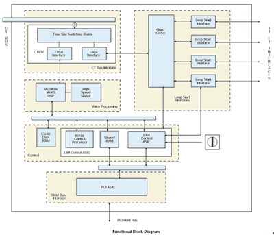 可下載的Spring Ware固件算法,由板內(nèi)DSP執(zhí)行,可以提供可變的24Kb/s到32Kb/s的ADPCM編碼方式和48Kb/s到64Kb/s的A率或u率PCM編碼方式,采樣速率和編碼方法可以分通道選擇。應(yīng)用程序根據(jù)需要可以動態(tài)地改變采樣速率和編碼方式,以達到最優(yōu)的數(shù)據(jù)存儲和語音質(zhì)量。其他的編碼算法(象GSM和G..726)可以在支持VPIM標準的應(yīng)用中使用。