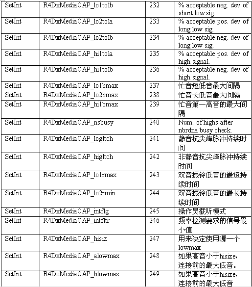 必須注意,調(diào)用API級的函數(shù)設(shè)置一個CTADE_A參數(shù)可能不只改變電路板級的參數(shù)。例如,R4DxMedia中,使用函數(shù)MediaSetBool設(shè)置REGID_R4DxMediaDisableAllToneDetection(280)為0或1來清除Dialogic提示音ID。