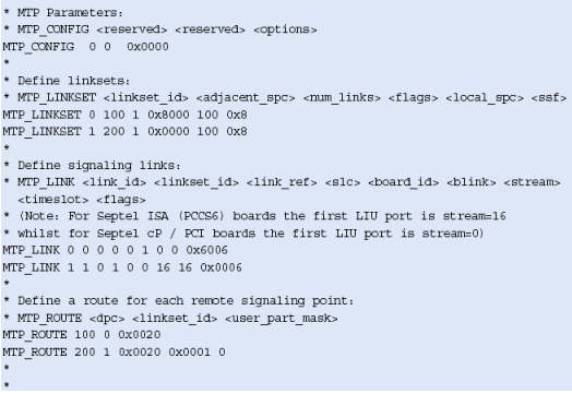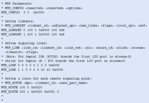 注意,這些不包括任何設(shè)置或定義信令板卡的命令,應(yīng)該象定義標(biāo)準的單系統(tǒng)一樣定義。MTP_ROUTE <up_enable>參數(shù)為ISUP設(shè)置,在上例中用戶部分SI=5。