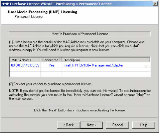5. 聯(lián)系你的廠家購買一個永久許可證。你必須提供從在4步中得到的MAC地址。可獲得的許可證列表參見表3""HMP